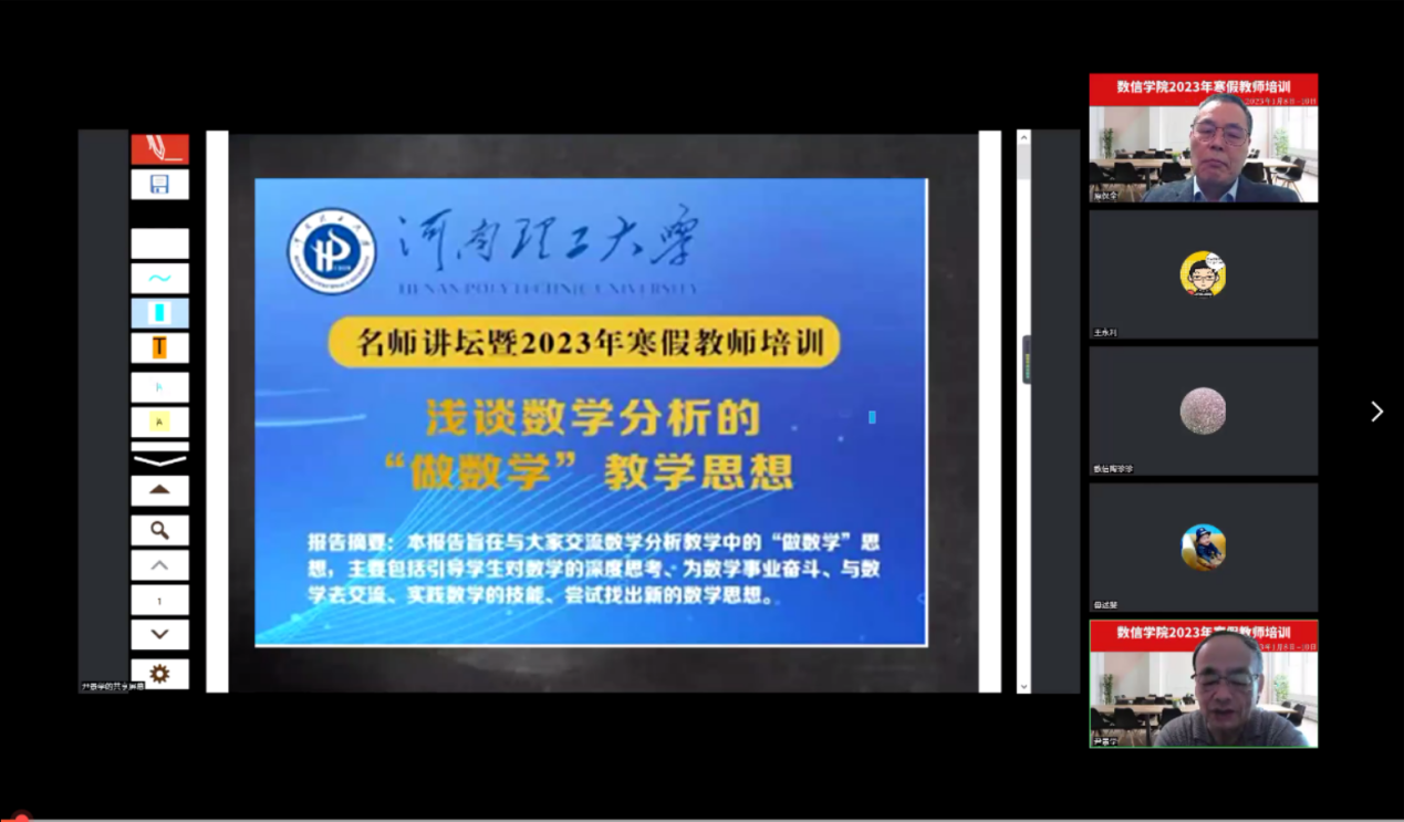 为培养和提高全院教师的教育教学能力,1月9日上午,学院邀请华南师范大学尹景学教授,开展题为《浅谈数学分析的“做数学”教学思想》的线上培训报告。